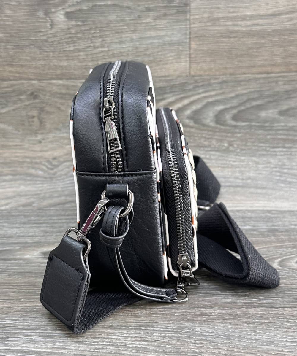 Cow print PU crossbody handbag purse removable wallet Top zip closure, adjustable strap Size: 8.6" X 3" X 6"