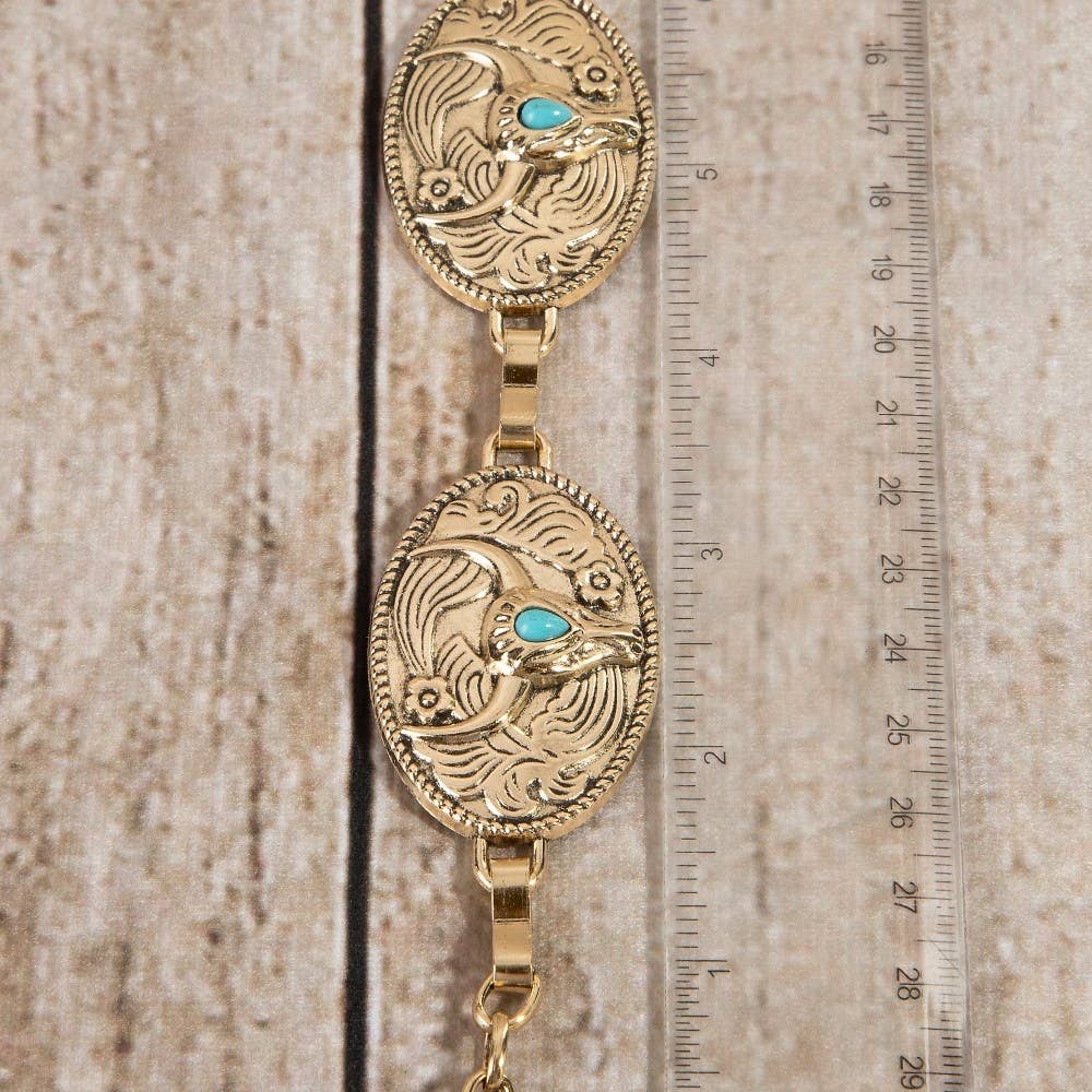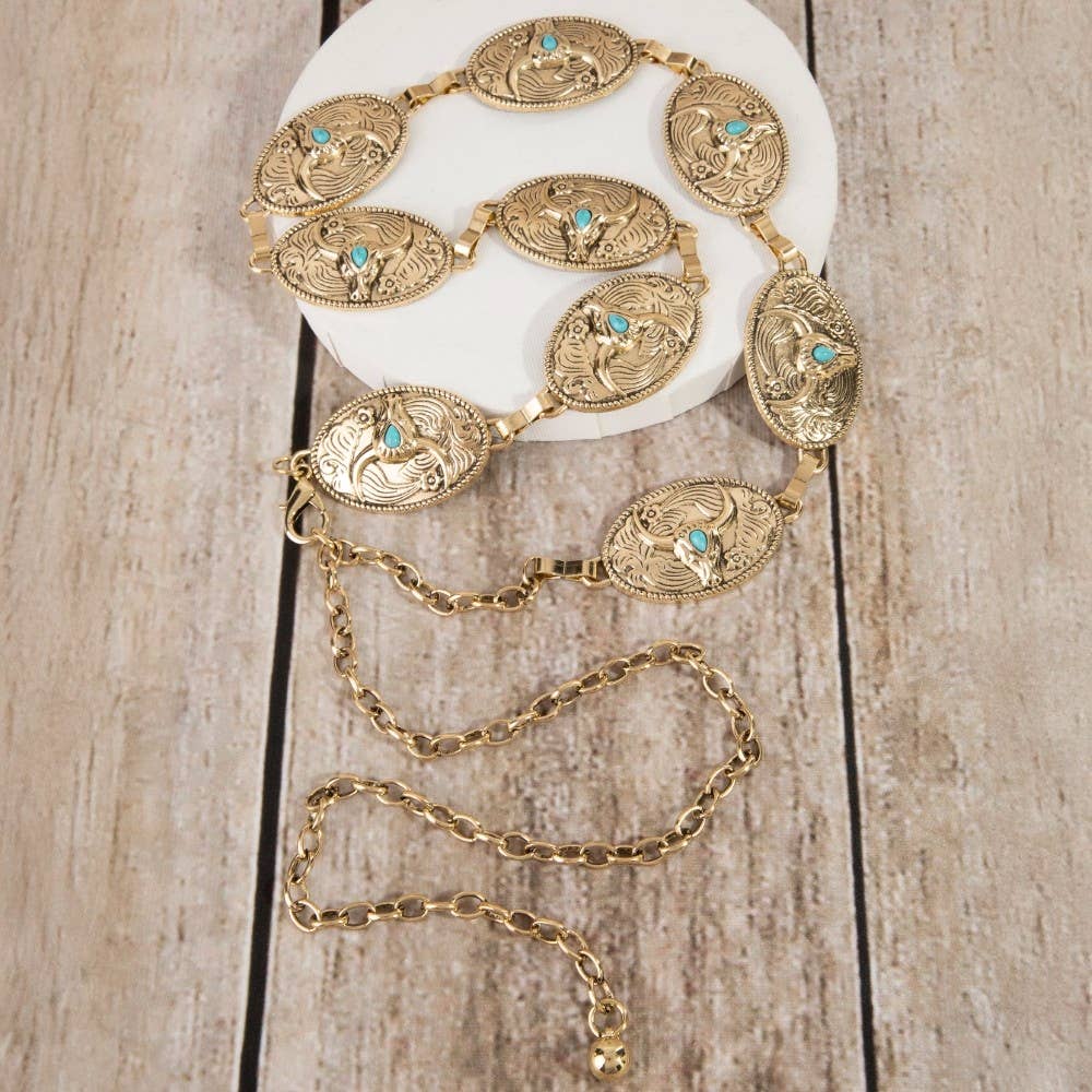This chain belt showcases a unique turquoise stud bull head concho style. Elevate your ensemble with this chic, timeless chain belt. This chain belt approximately measures (Inches): L: 24 Extender: 20 100% METAL